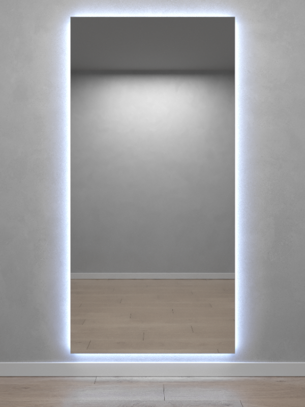 Безрамное зеркало прямоугольной формы с контурной (тыльной) холодной подсветкой, свет 6000К. Подложка из высококачественного алюминия, светодиодная лента защищена матовым свето-рассеивателем от попадания пыли и влаги. Есть вывод 220W для подключения к сети, включение подсветки от выключателя на стене, либо от розетки. Возможно установить сенсорную кнопку на заказ в любом месте зеркала.