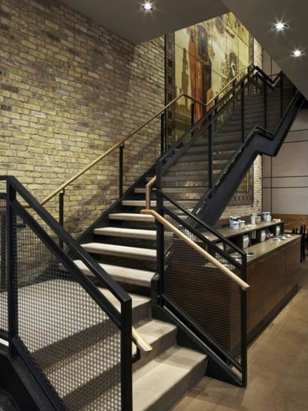 Стиль лофт в интерьере особенно гармонично смотрится при оформлении помещений с потолками высотой от 4-5 метров. Элементы ограждений, лестниц, например, можно плавно стилистически объединять с фактурой стен или предметов интерьера. Ограждение Лофт 4 – пример того, как цветовое решение перилл пересекается с цветом и фактурой кирпичной кладки. В данной модели перилла представлены в двух вариациях – привычные перилла в составе самого ограждения и дублирующие перилла в виде труб. С одной стороны лестницы, вдоль стены, перилла установлены на широко расставленных друг от друга стойках, с противоположной стороны перилла крепятся к ограждению. На представленном образце ограждения с внешней стороны элементы как прямоугольной формы, так и в форме параллелепипеда. Внутри элементов сетка. Тем самым соблюдается одна из самых важных характеристик стиля лофт – открытость и прозрачность.